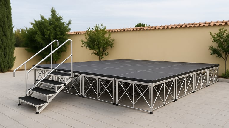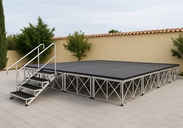 Flexible stage solutions with adjustable heights and sizes for conferences, exhibitions, and live events.